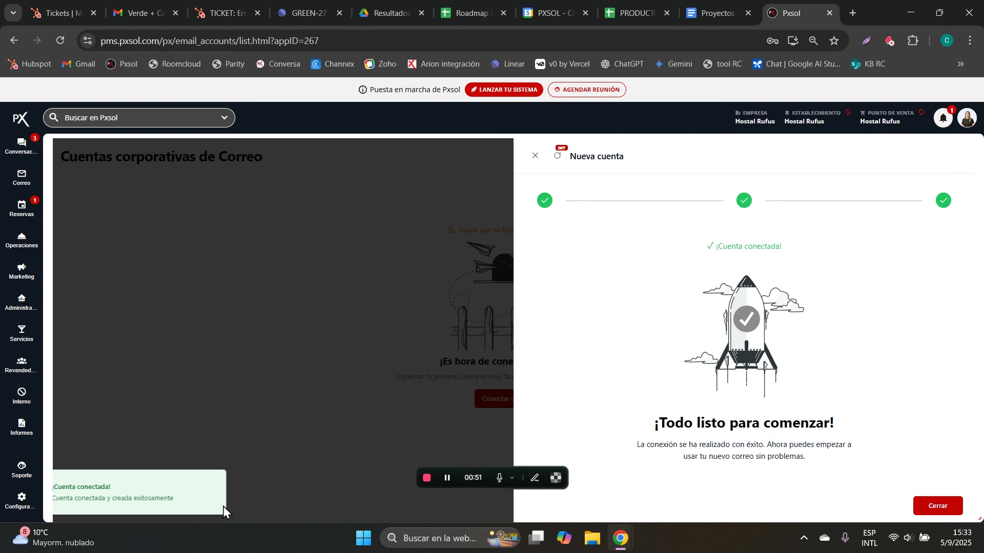 Haz clic en “Cerrar”. La nueva cuenta aparecerá en la lista de “Cuentas corporativas de Correo” con el estado “Conectado”.