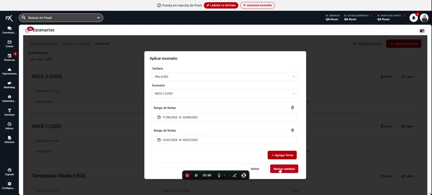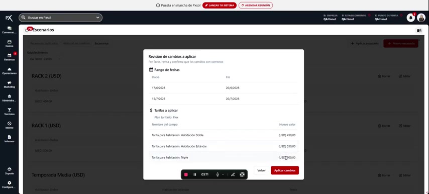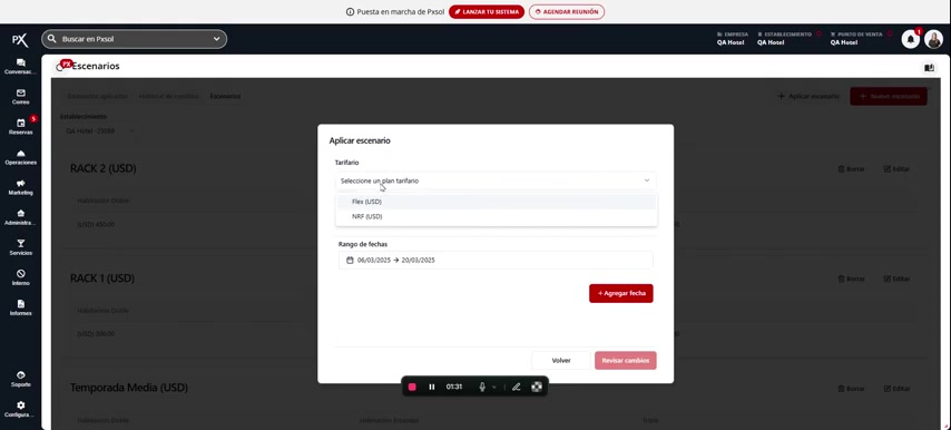 La funcionalidad de gestión de escenarios de tarifas te permite crear y aplicar conjuntos de tarifas predefinidas, conocidos como escenarios, a planes tarifarios específicos para rangos de fechas definidos. Esto facilita la gestión de precios estacionales o por eventos de manera masiva.Interfaz de Escenarios