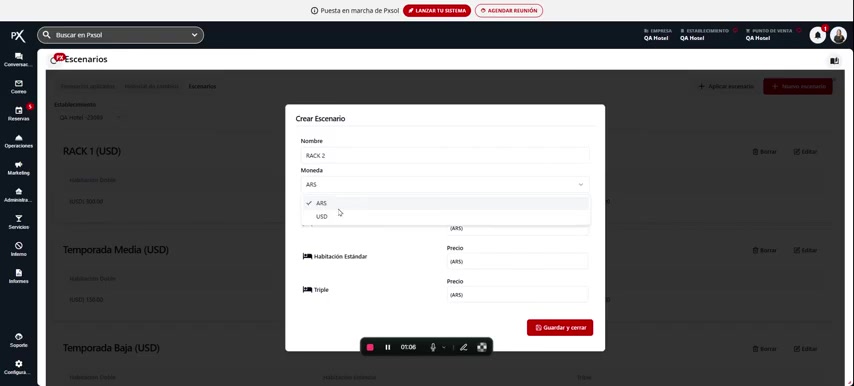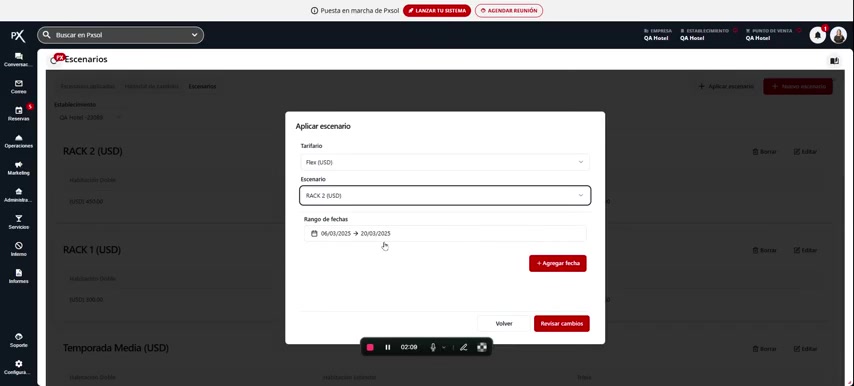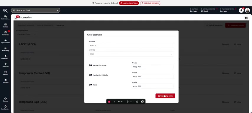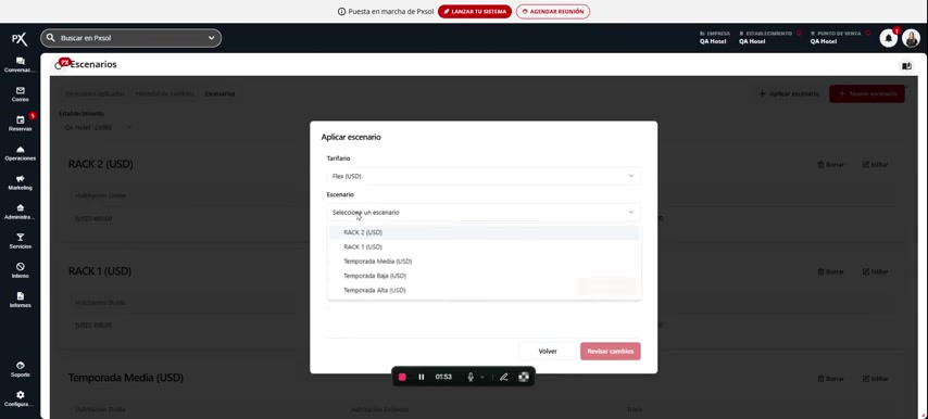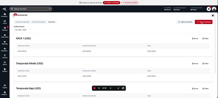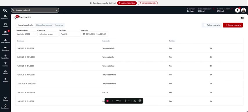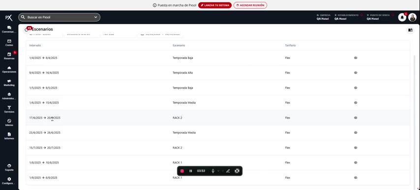 Escenarios: Contiene la lista de todos los escenarios creados, mostrando el nombre del escenario y las tarifas asignadas a cada tipo de habitación. Desde aquí, puedes crear y visualizar los escenarios.