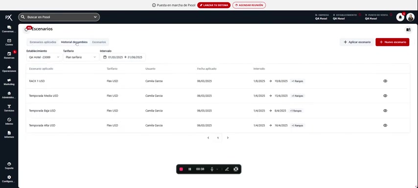 Historial de cambios: Funciona como un registro de auditoría, mostrando todos los cambios realizados, el plan tarifario modificado, el usuario que realizó la acción, la fecha y el intervalo afectado.