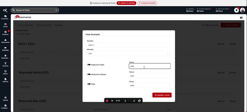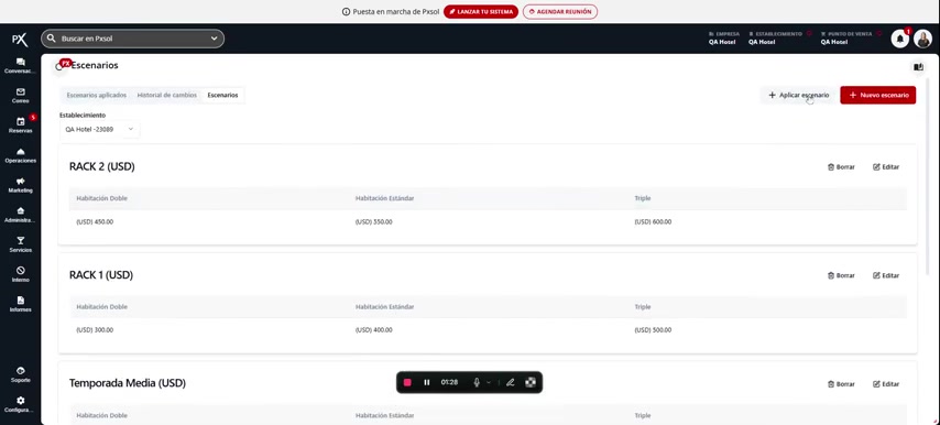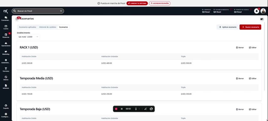 Pestaña de Escenarios mostrando diferentes temporadas (RACK 1, Media, Baja) con sus precios por tipo de habitación.