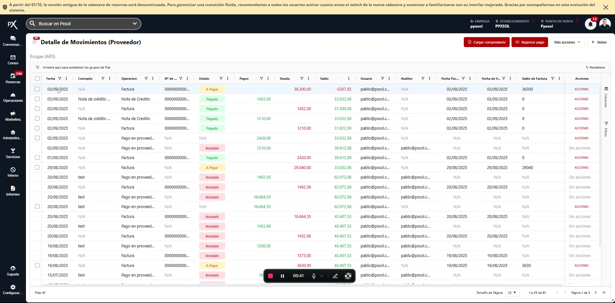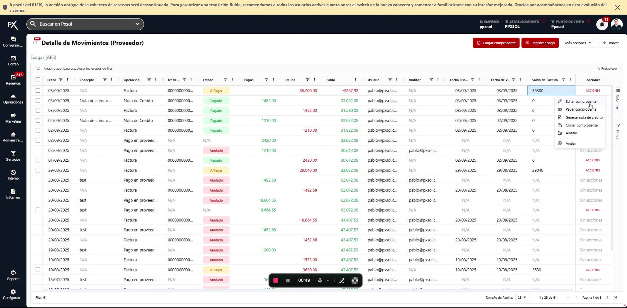 En el detalle de movimientos del proveedor, localiza la factura que necesitas anular.