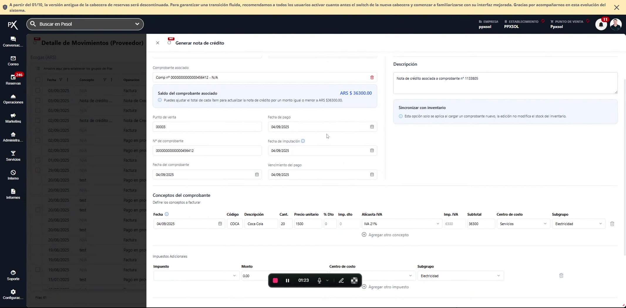 Si es necesario, corrige o modifica los datos del encabezado del comprobante, como el número de punto de venta y el número de comprobante de la nota de crédito.
